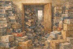 もともとは棚にきちんと飾られていた形跡があります。しかし、物量が増え続けると、収納の限界を超えます。やがて「飾る」から「積む」へと変わります。